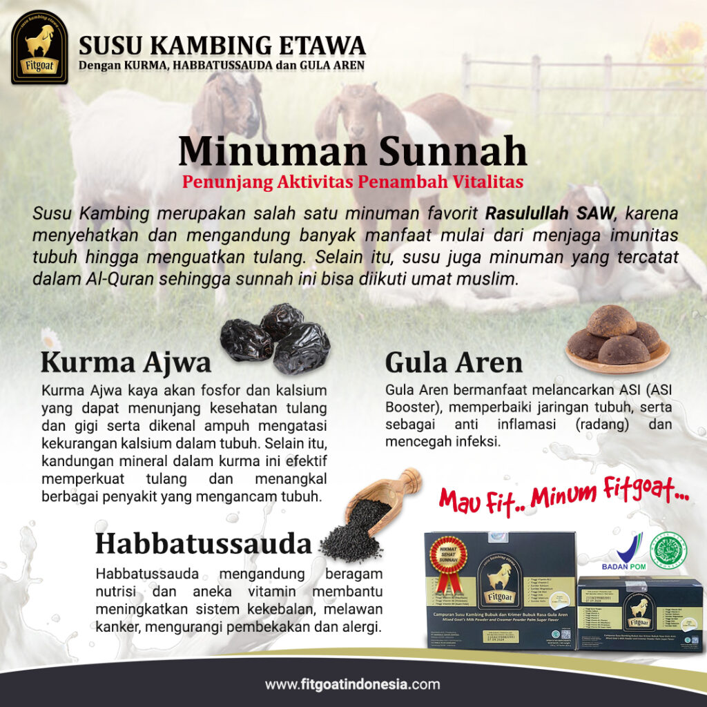 Salah satunya dengan minum susu kambing. Jadi, dengan minum Fitgoat kita juga turut menerapkan sunah Rasul. Selain dapat berkahnya yang tak kalah penting juga dapat manfaat sehatnya.